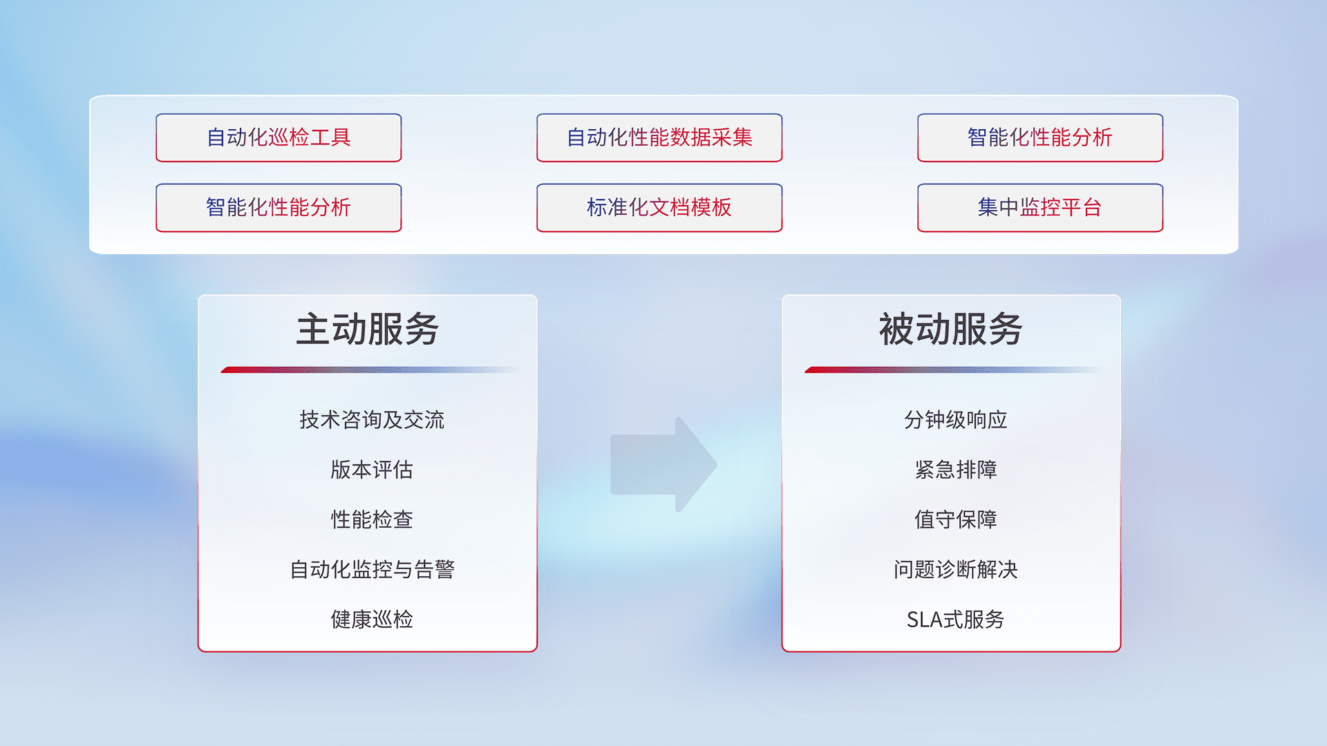 智能化工具和标准化文档,,保障服务质量,,提供主动服务(包含技术咨询、、版本评估、、性能检查、、自动化监控与告警、、健康巡检)和被动服务包含(分钟级响应、、紧急排障、、、值守保障、、、、问题诊断解决、、、SLA服务)。。。。